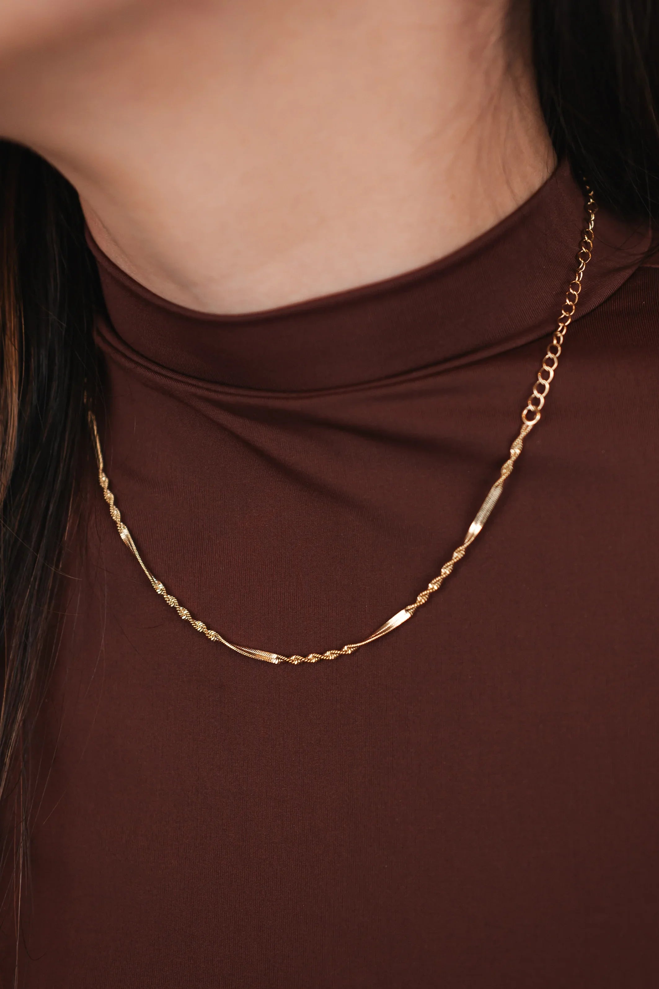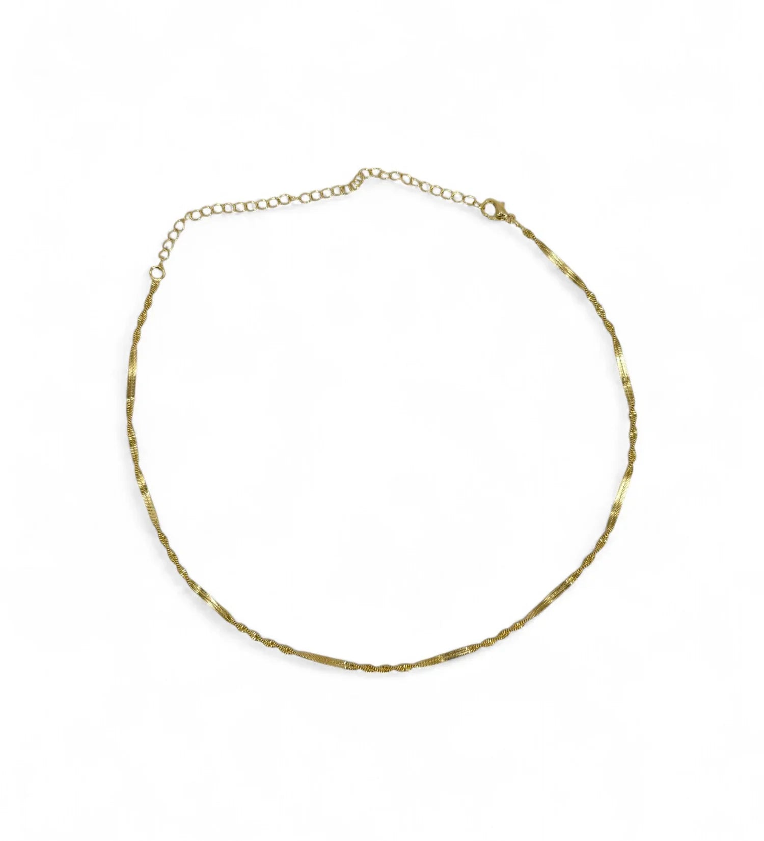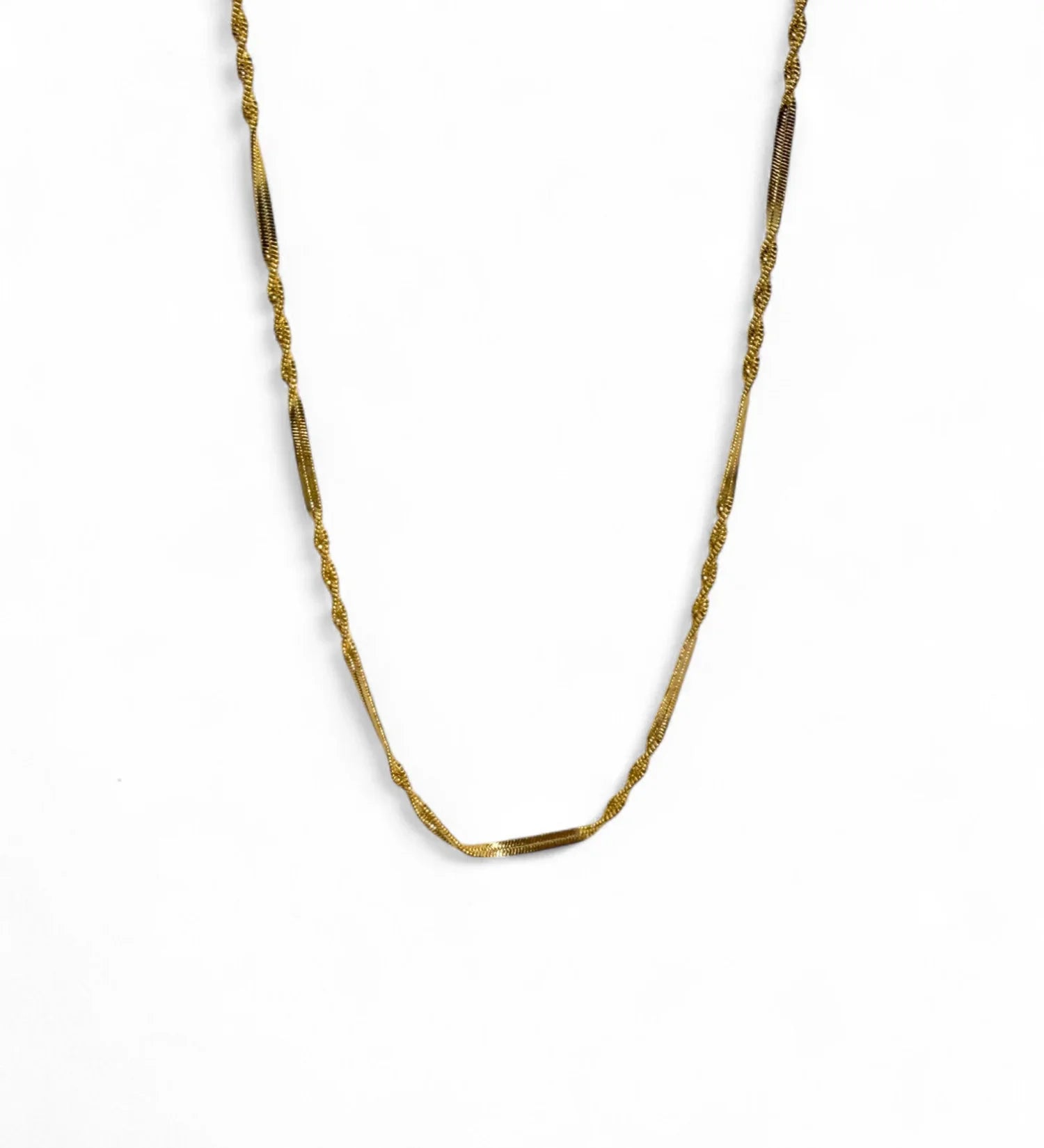 Delicado e cheio de estilo, o Colar Patrícia traz o charme da malha singapura com acabamento torcido, criando um efeito sofisticado e moderno. Banhado em ouro 18k e com acabamento em verniz especial, é uma peça versátil e ideal para quem ama composições leves e elegantes.