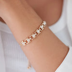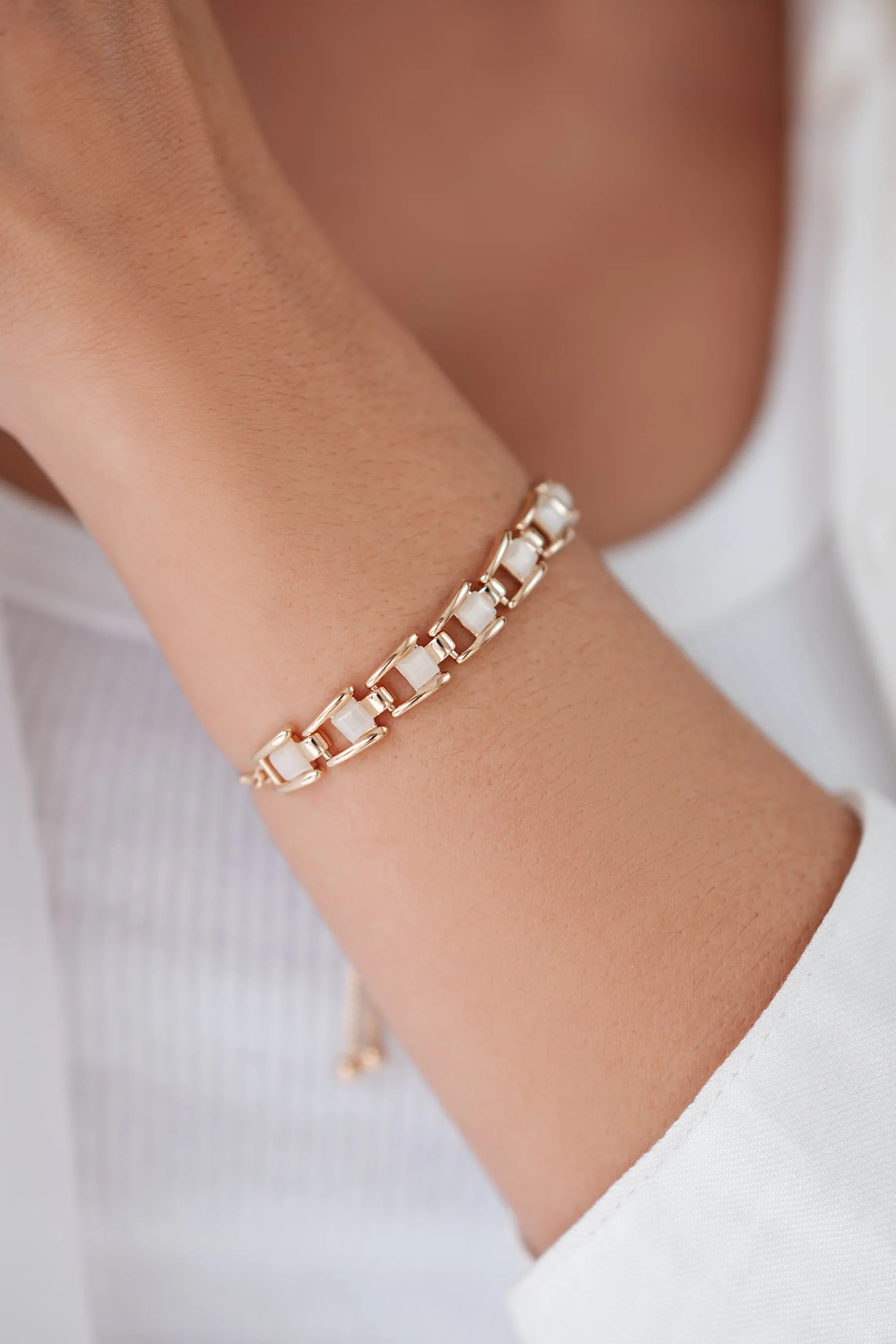 Delicada e elegante, a Pulseira Stella traz um charme sutil com seu design minimalista. Com pedras brancas em formato quadrado cercadas por detalhes dourados, essa joia banhada em ouro 18k é perfeita para compor produções sofisticadas com um toque de suavidade e leveza.