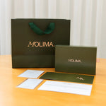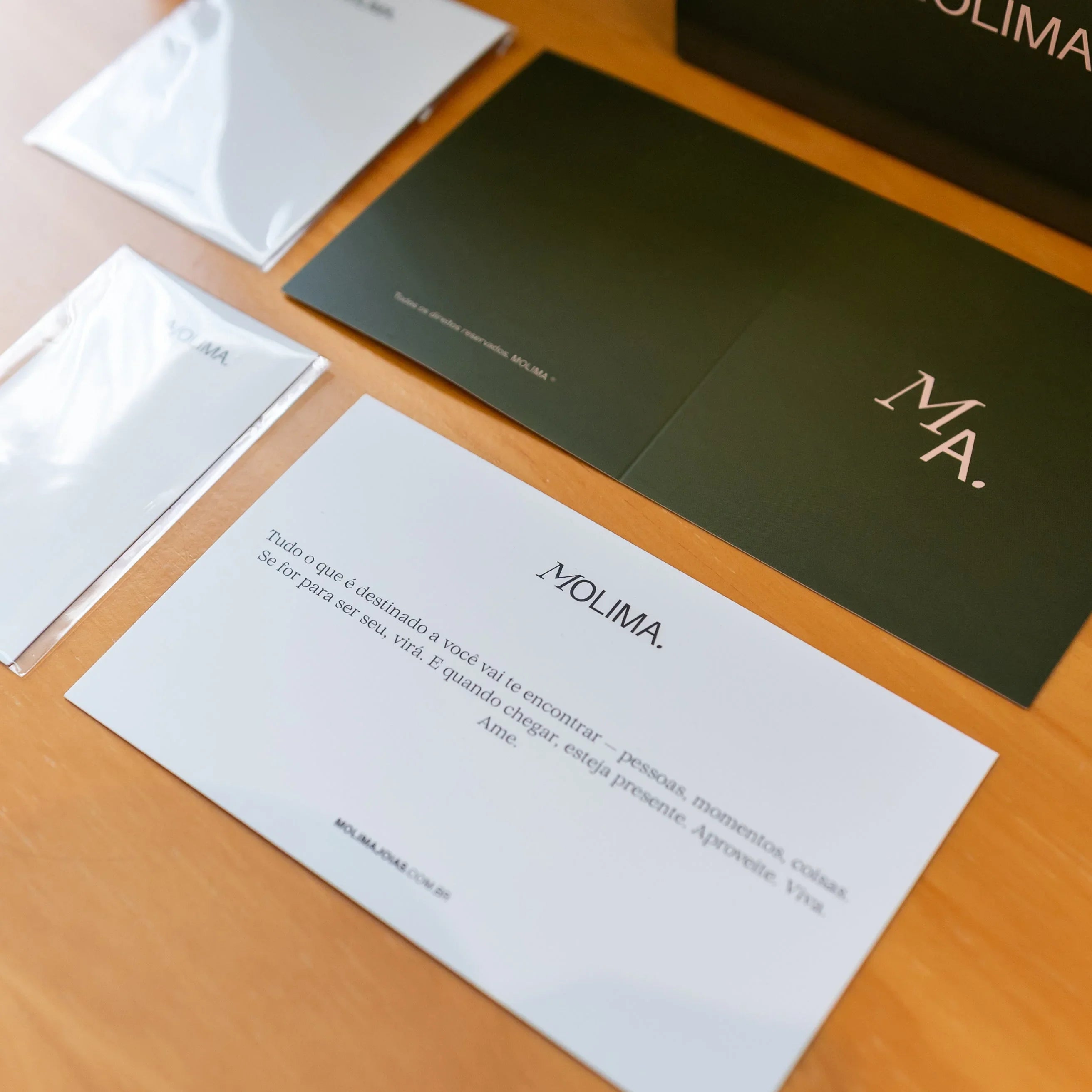 Mais do que uma embalagem, a sacola MOLIMA é uma extensão da experiência da marca. Feita em papel triplex 225g com laminação fosca e alça de gorgurão, ela une estrutura e elegância em cada detalhe. Ideal para presentear ou guardar suas joias com estilo, ela tem o tamanho perfeito para acomodar com segurança e charme as suas peças favoritas.